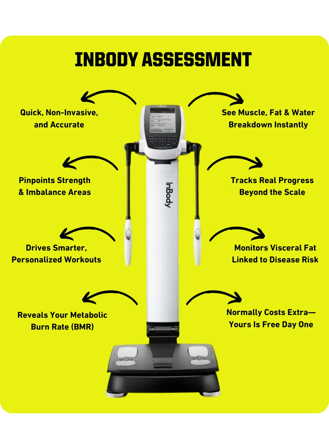 The InBody Scan is a quick, non-invasive assessment that measures body composition—like muscle mass, body fat, and water balance. It gives you a clearer picture of your health than a scale ever could. It also helps us design a plan that truly works for your body.